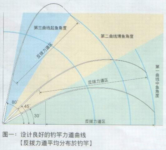 设计良好的钓竿力道曲线(反拨力道平均分布於钓竿)
