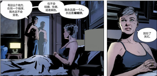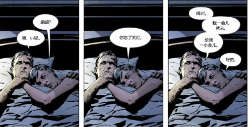 主刊故事中猫女逃婚,蝙蝠侠备受打击。我很难受蝙蝠侠难道就不能获得凡人的幸福吗?还好看到了这个短篇,似乎是地球2的故事但有了改编,猫女蝙蝠的爱情有了一个完美结局。谁说英雄的谢幕一定要轰轰烈烈?在爱人的陪伴下安然离去也是一个很好的结局。