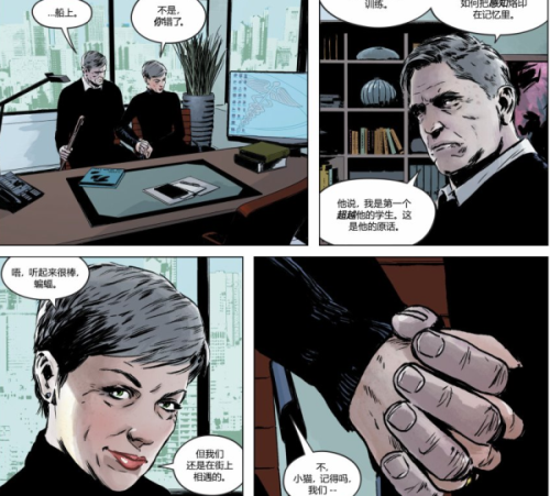 布鲁斯上去抱着她安慰她,小猫表示自己没事。当布鲁斯继续刚才的话题时,他似乎有些遗忘自己打算说些什么,小猫已经替他回答了。