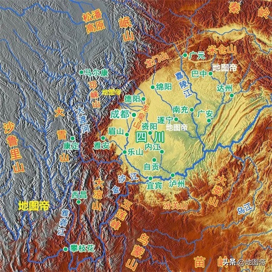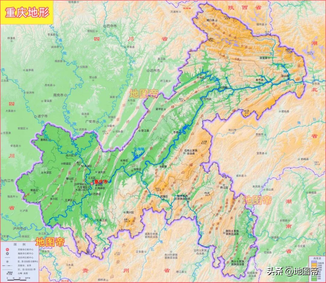 重庆位于四川盆地东部川东平行岭谷地区,总体地势南北高,中间低,东北有大巴山脉及支脉观面山、巫山等,东部有川东平行岭谷的方斗山、七曜山等,东南有武陵山脉支脉毛坝盖等,南部有云贵高原及支脉大娄山等,西部是川中丘陵,中部明月山是重庆与四川的界山。