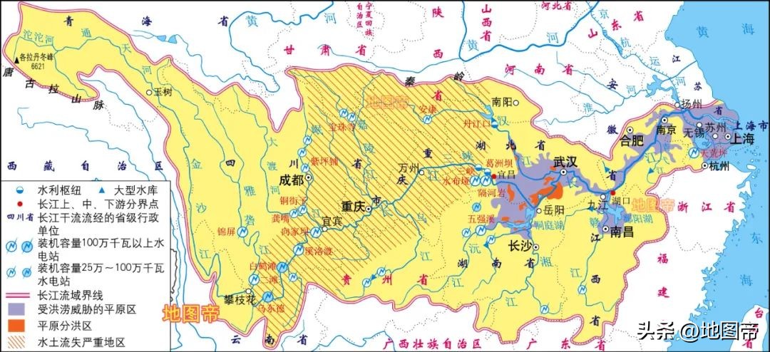 长江全长约6397千米,居世界第三位,次于非洲的尼罗河和南美洲的亚马逊河,在上海并入最后一条支流黄浦江,再注入东海。