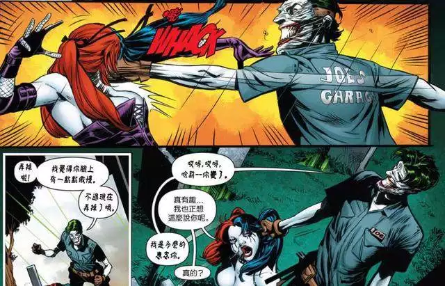 在动漫和漫画中,经常出现小丑虐待小丑女的画面,他对待小丑女就像一个工具般,需要的时候喊一句“甜心”,不需要的时候恨不得将她绑上火箭送走。或许在小丑的眼里,他只想挑战蝙蝠侠,如果小丑困于爱情的话,相信不少小丑死忠粉会失望的。