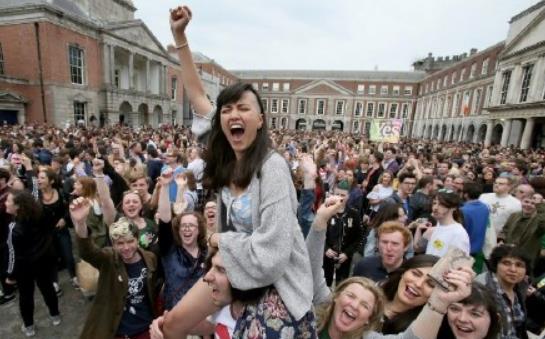 26日,当公投结果公布时,数千人聚集在都柏林城堡前的广场,人群欢腾,甚至有支持者喜极而泣。