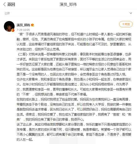 结果郑伟就是在单亲家庭里长大的,而且从小在单亲家庭里长大,并不代表着郑伟就缺爱,相反,他是在爱里长大的,母亲对他很好而且从未让他感受到过单亲家庭的特殊,为此郑伟自己还发过长文,说过自己在单亲家庭里长大的故事,并且一直在鼓励其他单亲家庭的孩子,告诉他们不需要有顾虑。