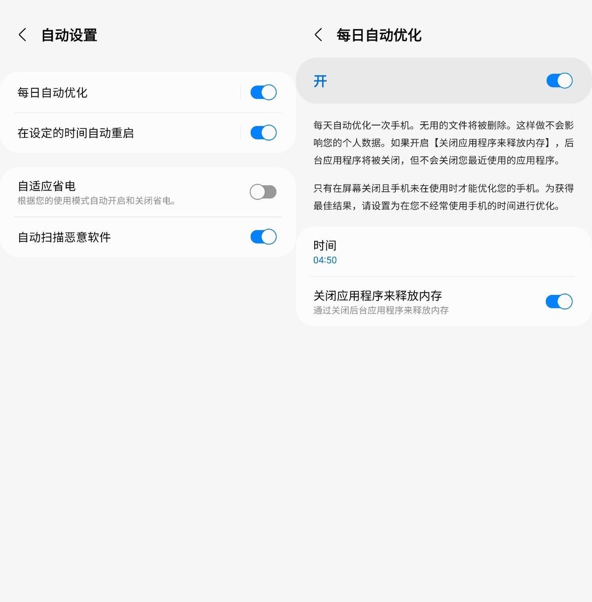 选择“每日自动优化”,点击进入,可选择每日优化的时间,个人建议选择在睡觉时间进行,系统会在后台静默进行优化,系统优化时不会删除个人数据文件,大可放心使用。