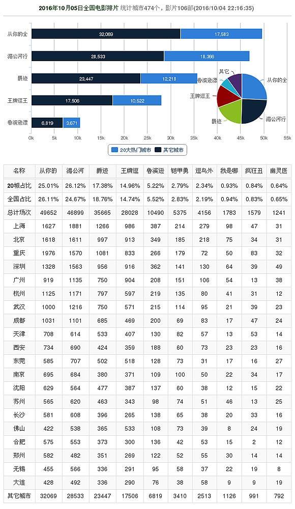 2016年10月05日全国电影总排片截止22:14约190143场,较昨日减少26211场。