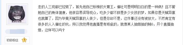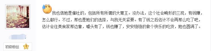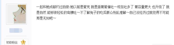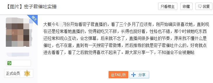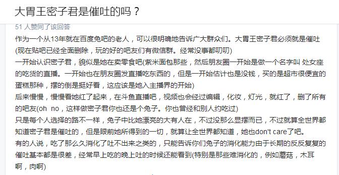 而在知乎也有关于她吃播催吐的话题,一位从13年就在百度兔吧的老人很明确的告诉大家,大胃王密子君必须是催吐(下面进行了说明
