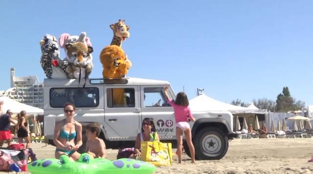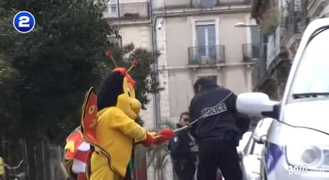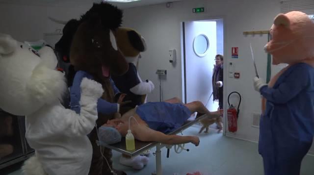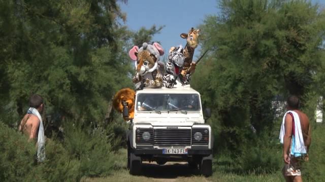 雷米·盖拉德的“人间动物园”则更像一场审判。雷米和他的伙伴们披着动物的外衣,有时在各个空间场域对人类的不可言说的习性进行模仿和扮演,让“动物们”成为兽医院的医生,让“动物们”观光人类生活,有时对路人进行随机无害的“调戏”(随后被暴打或驱逐),甚至侵犯警察(警察已经习以为常)。