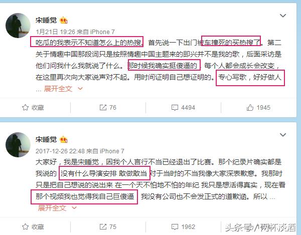 宋睡觉在微博中表示:没有什么导演安排,敢做敢当,表示歉意,但不会有正式道歉哦!有瓜友表示::你就是一个枪耙子。把你揪出来,就是为了告诉大家。让你们在下面瞎b说啊,瞎b说。你以为你是普通人就不追究你啦?看你不顺眼就把你揪出来买上热搜,让你一辈子身败名裂,不得翻身。目的就是让大家都tm闭嘴。还管不了你们了?