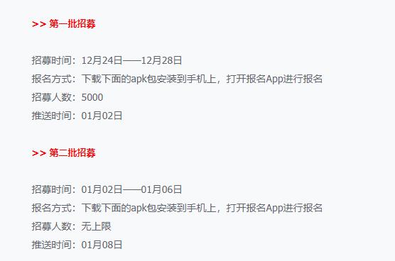 第一批招募时间为12月24日——12月28日,招募5000人。第二批招募时间是1月2日——1月6日,招募人数不上限。