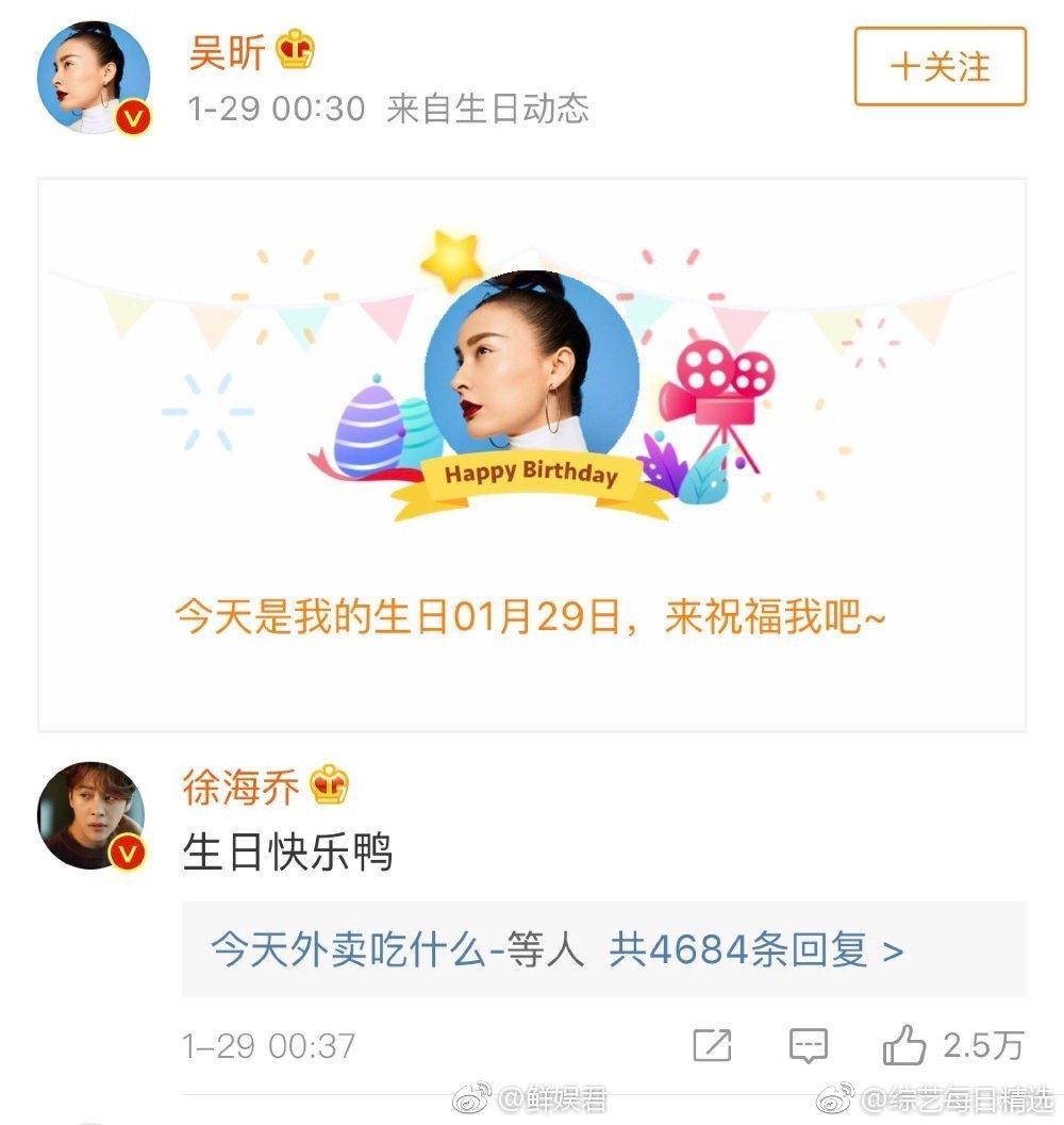 1月29日是吴昕的生日,徐海乔也“及时”送上了祝福。