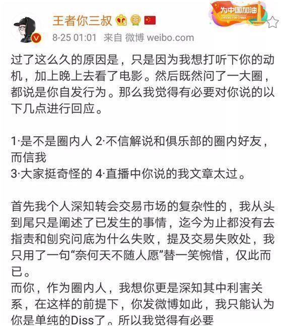 而就在昨天晚上王者三叔突然在凌晨一点钟发微博长文回应之前辰鬼批评他不是圈内人,却喜欢自居专业人士指指点点,并表示为什么大家都不信俱乐部和圈内人士的说法而单纯相信三叔。为此三叔发表长文回应表示:自己是不是圈内人这些都不重要,重要的是放假消息欺骗粉丝。而对于辰鬼质疑其关于一笑去留的文章三叔表示他和辰鬼所讲的都是一个意思,并没有胡说八道。并说辰鬼的diss是无理由的,他表示感到诧异和奇怪,因为不知道辰鬼有何理由来diss他,难道是因为你和我都说过一笑要去某俱乐部?最后,三叔回应辰鬼指责其文章太过的问题,三叔认为这可能是他深夜码字所以词不达意,但是后面他还是补充和更改了,如果有问题,他完全可以指正。