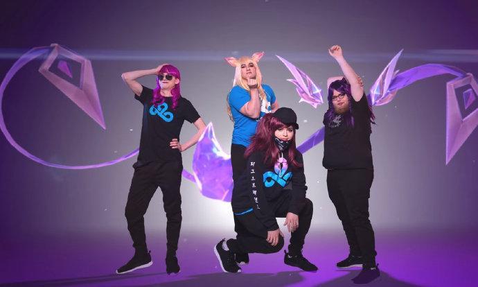 KDA女团是由拳头公司为去年的S8世界赛专门推出的虚拟偶像团体,主要成员是由游戏内的四位女英雄:阿狸、伊芙琳、卡莎和阿卡丽组成。自从官方发布宣传视频和系列皮肤以来,KDA女团的人气热度一直不减。在C9战队公布的最新照片中,我们可以看到他们这次果然以KDA女团为原型进行COS。