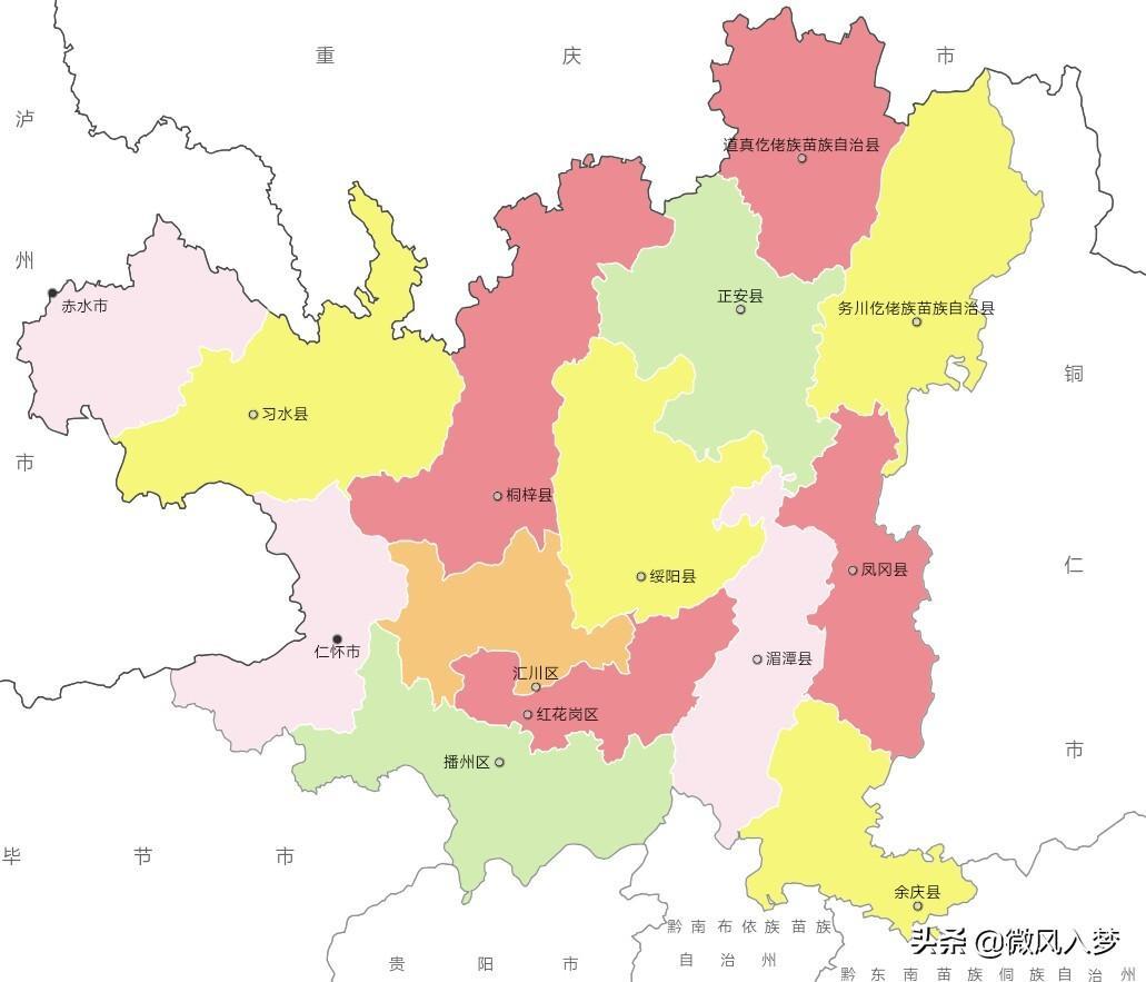县(7个):桐梓县、绥阳县、正安县、凤冈县、湄潭县、余庆县、习水县