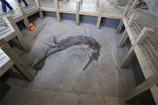 该化石目前收藏于贵州省安顺市兴伟古生物化石博物馆,保存得非常完整,总长七点六米,龙角从头部的最宽处左右两边长出,双角对称,长约二十七厘米,略显弧形,这对"龙角"在龙头上翘出,酷似传说中龙的形象。