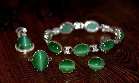 俄碧多属于半透明状态,一眼望穿,却又看不清楚。透光观察,可以看到内部呈现一簇一簇排列乱散的纤维。少数会形成猫眼效果,手拿碧玉左右晃动,一条光亮的线在玉质底子上左右晃动,就像猫眼睛一样。
