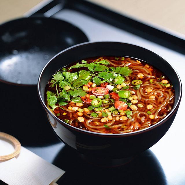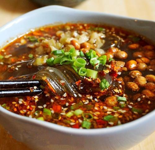 将适量红薯粉在高汤里烫软,放在调好碗底的碗中加入高汤,加两小勺炒好的肉臊子,表面撒上炸花生米,香菜小葱,淋上咱们做好的辣椒油,爱吃麻的朋友可以适量添加麻椒面或麻椒油。一碗酸辣开胃的酸辣粉就制作完成了。