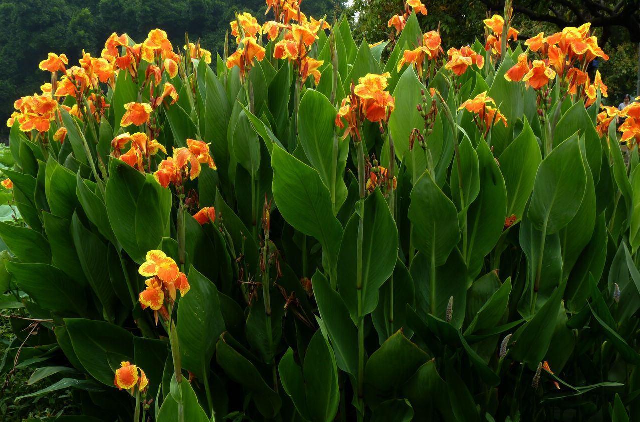 热带风情的美人蕉有宽大的枝叶和明亮的花朵。有各种各样的品种 - 有些只长60CM; 其他人超过180CM。它能在湿润的土壤中生长良好,甚至可以耐受积水。