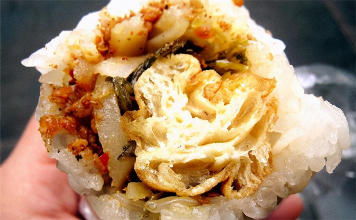 将糯米蒸熟后粘上黄豆粉,将油条卷在糯米饭里,撒上黑芝麻,搭配上榨菜、火腿等食材,口感绝佳,让人百吃不厌。