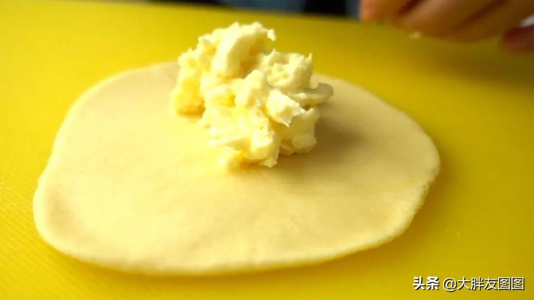 用擀面杖擀成小面片,包入一勺奶油奶酪。