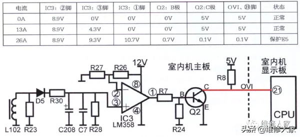 当压缩机电流由于某种原因变大,使得IC3的③脚电压高于②脚电压,IC3内部放大器状态翻转,其①脚为高电平10.7V, Q2的B极电压变为高电平0.7V,其C极与E极深度导通,OVI引线即CPU的⑥脚接地,电压为低电平约0.1V, CPU检测后判断压缩机运行电流高于保 护值,连续3S后停止压缩机和室外风机供电,待3min后再次为压缩机和室外风机供电,如 CPU的(8)脚仍为低电平,则再次停止供电,反复约5次后不再为压缩机和室外风机供电,指示灯闪烁,并显示E5代码。