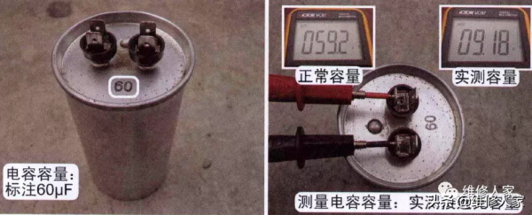 原配电容上面标注60,表示容量为60UF,本机电容的铭牌标识位于下部,使用万用表电容挡,表笔直接测量两端,正常容量应为60UF,而实测容量不足10UF,说明压缩机电容接近无容量损坏。