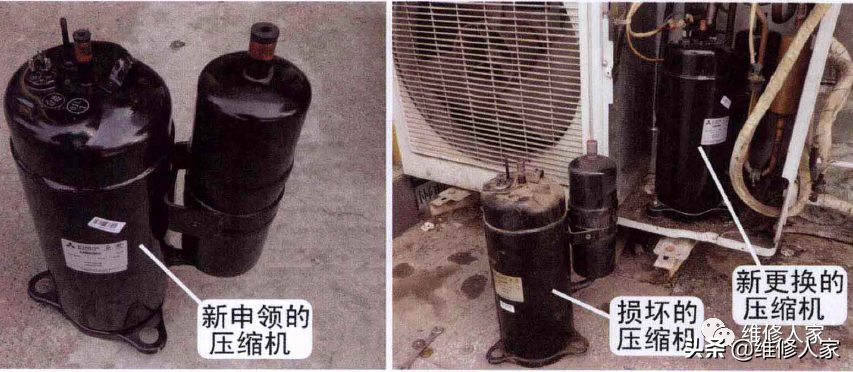 ① 压缩机更换过程比较复杂,因此,确定其损坏前应仔细检査是否由电源电压低、电容无容量、接线端子烧坏、系统加注的氟过多等原因引起,在全部排除后才能确定压缩机线圈短路或卡缸损坏。