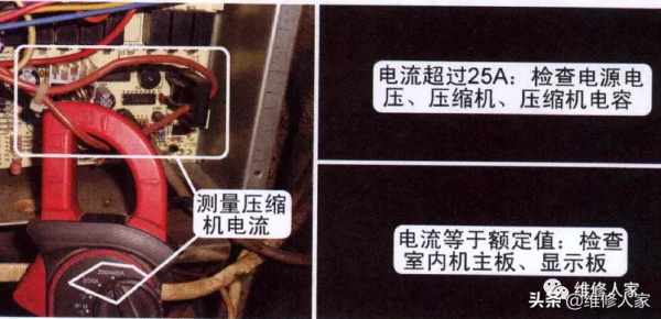 将空调器上电开机,使用万用表电流挡测量压缩机电流,实测电流超过25A约3s:说明压缩机启动不起来,主要检査电源电压、压缩机、压缩机 电容等部件。
