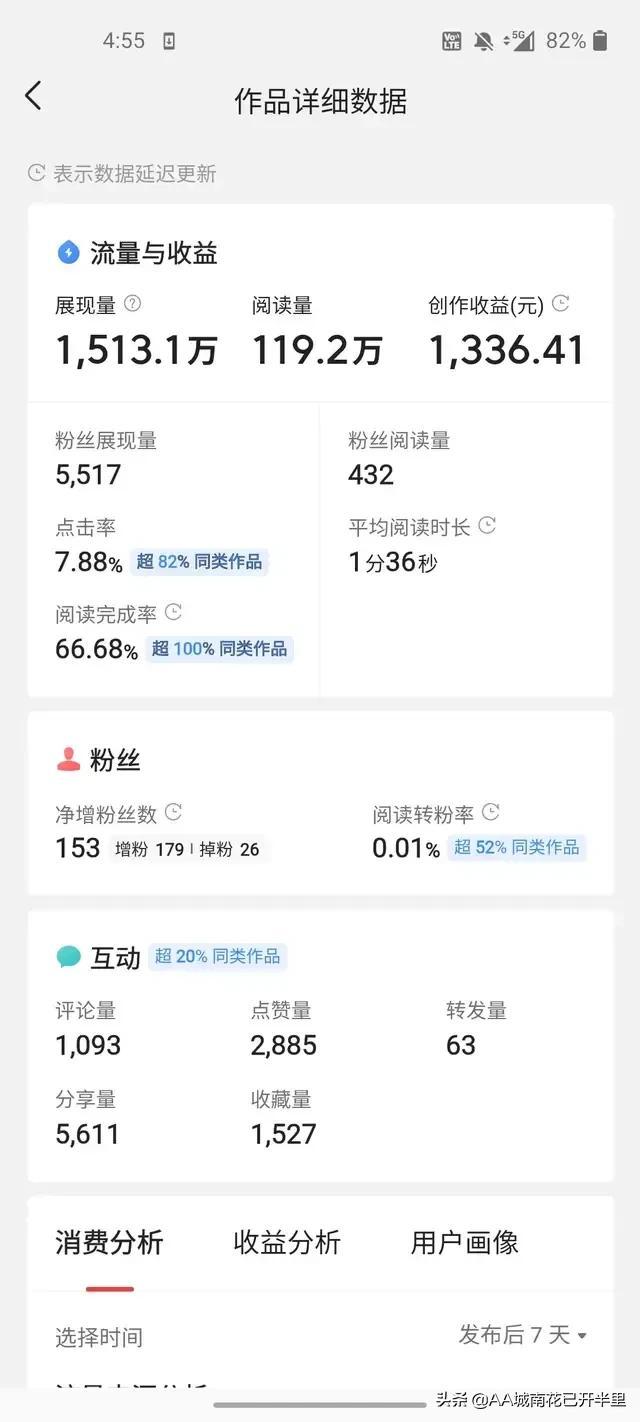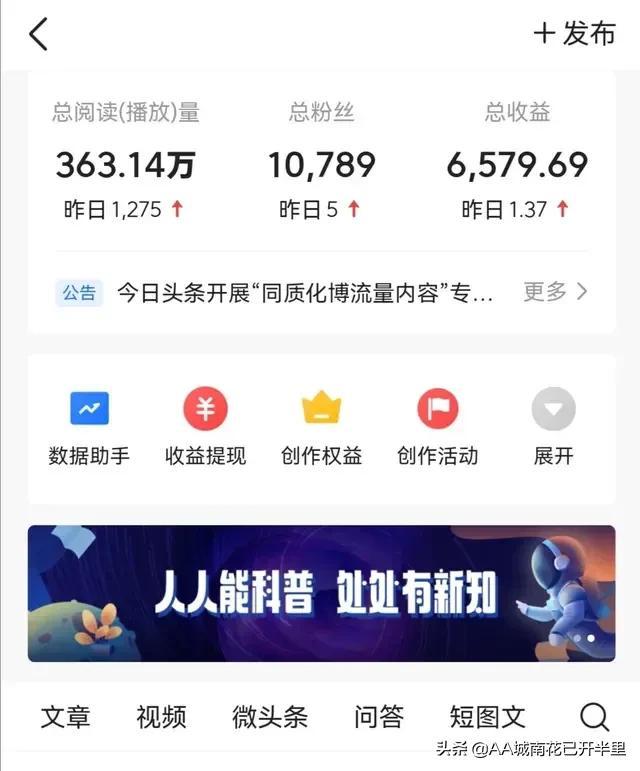他几乎都是爆款,这都没赚钱,可想而知自媒体多难赚。他赚了很多钱奥,他的那个钱和我们普通老百姓比我们会吓死,他的一条都是几百上千元奥。普通上班的谁一天这么多钱。我都一年了,文章没人看,粉丝更少,总收益才十一块多。百元梦,千粉梦,还都是梦!