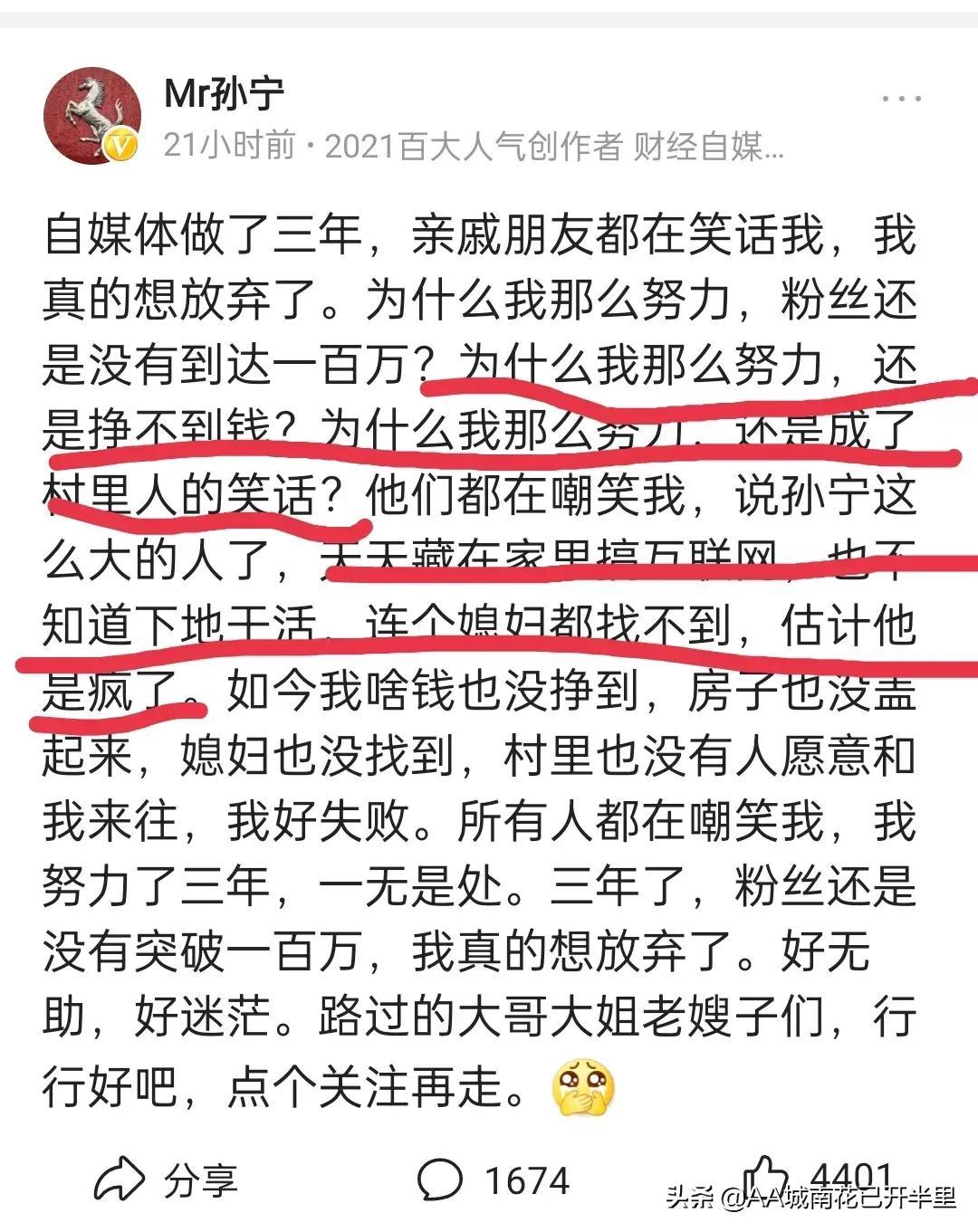 孙宁不过是发个微头条叫苦圈粉而已,年度百大创作者不是白给的,他账号随随便便一年几十万,看看万小刀,人家一篇好的图文收益就上?万了!孙宁认为的是暴富呀。你1万粉丝一月有1千元收益吗?努努力几千还是可以的!