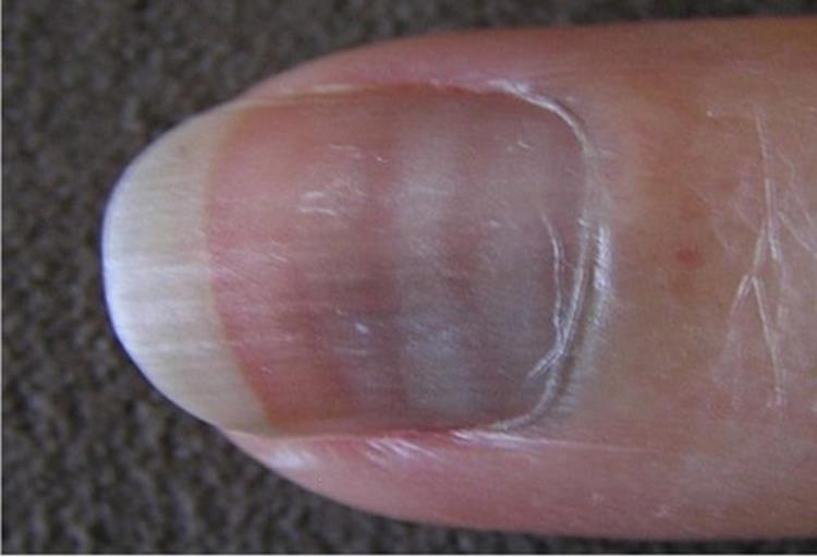 Terry甲的特征是近端大约80%的甲床呈白色,而远端则保持正常的粉红色(见图4)。这种白色区域通常是甲床血液供应不足引起的。Terry甲是肝脏疾病的标志,但也可能与糖尿病、充血性心力衰竭、甲状腺功能亢进或老化有关。