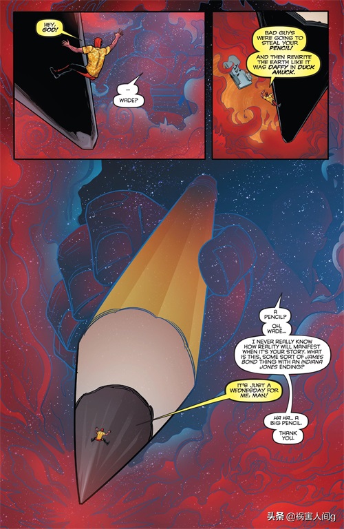 在2018年漫画《死侍:秘密特工死侍》中一个伏案创作的背影出现在虚空中并且有一只从天而降的巨型铅笔。