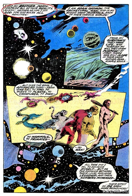 在1976年漫画《奇异博士》V2#13中,宇宙神明永恒告诉奇异博士“我和我的兄弟,死亡,构成了所有的现实。但是我和他都不是上帝,因为上帝统治着一切!”