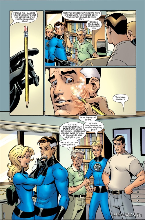 在2004年漫画《神奇四侠》#511中神奇四侠在看似天堂的地方打开了一扇门,走进门内看到了一个伏案画画的老者,这个老者用笔和橡皮就能创造或修改漫威宇宙的现实。