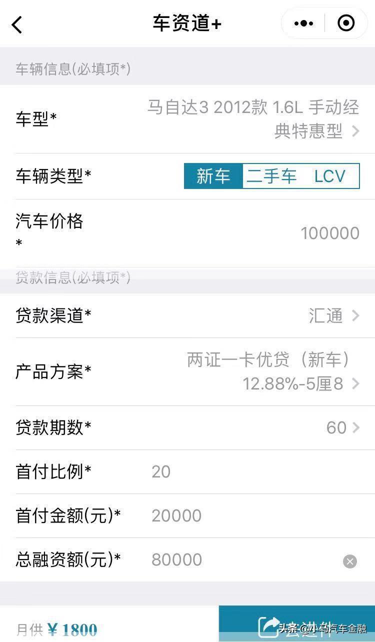 以长安马自达3为例,先看新车,小编选择的是马自达3 2012经典款,10万左右,小编用了自家的分期产品计算出首付和月供,可以看到10万的车首付2万,月供1800,小编相信,小资一点的上班族,这样的支出是能够承受得起的。