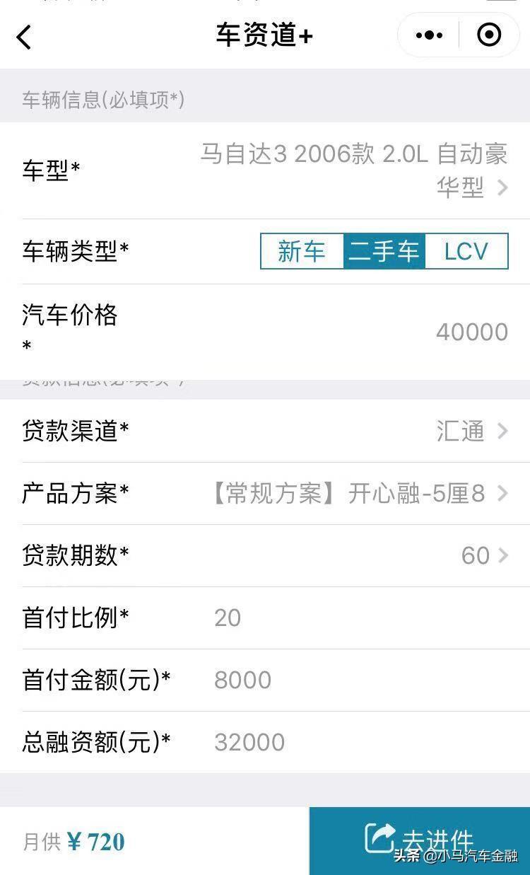 如果大家觉得这样的压力还是比较大,可以选择购买二手车,前段时间火爆全网的重庆保时捷女车主所驾驶的就是三手保时捷,这也说明二手车乃至三手车并不丢人,小编还是以马自达3为例,小编同样使用车贷计算器和自家的车贷产品算出首付和月供。以网上价格40000为准,分60期还完,首付8000元,月供720元。这样的购车压力,我相信任何一个在办公楼里上班的普通白领都能支付的起。