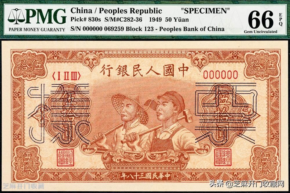 5:民国三十八年(1949年)第一套人民币“工农”伍拾圆,六号码,票样,PMG 66 EPQ,成交价格: RMB 24150