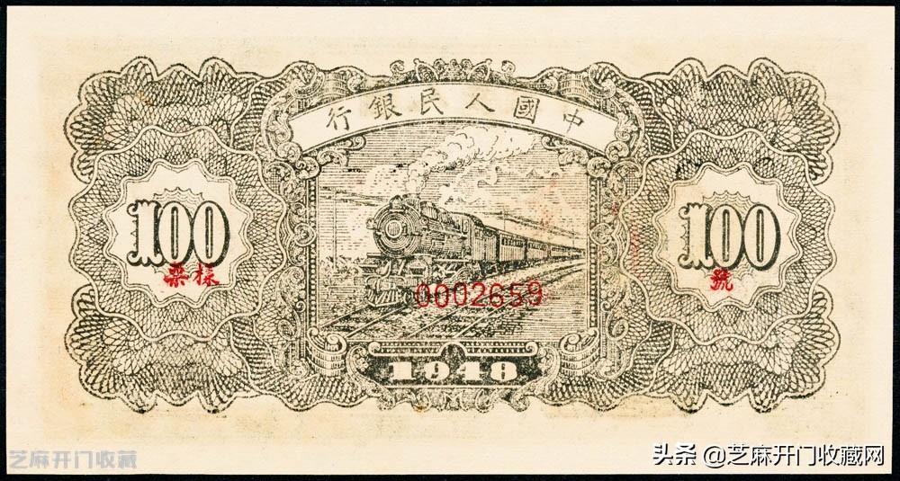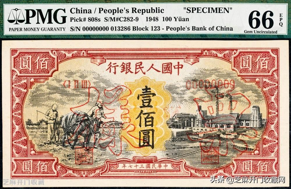 3: 民国三十七年(1948年)第一套人民币“耕地与工厂”壹佰圆,票样,PMG 66 EPQ,成交价格: RMB 29900