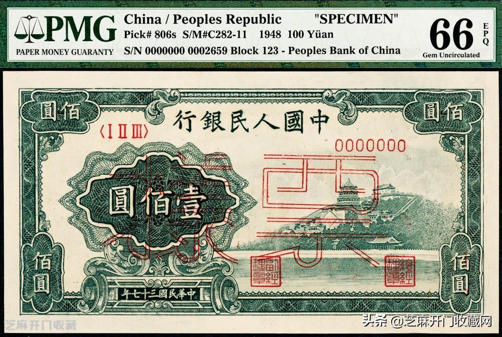 4:民国三十七年(1948年)第一套人民币“万寿山”壹佰圆,双面票样,PMG 66 EPQ,成交价格: RMB 26450