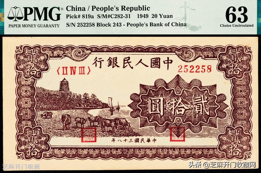2: 民国三十八年(1949年)第一套人民币“棕六和塔”贰拾圆,PMG 63,估价: RMB 无底价,成交价格: RMB 33350