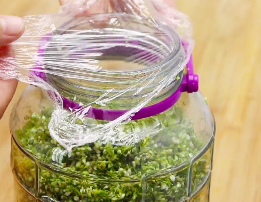 6.最后将这些腌制好的韭菜花,放在一个无油无水的密封罐中。在上面封上一层保鲜膜,然后再盖上盖子。阴凉通风处腌制七天就可以食用了。