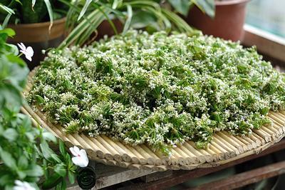2.冲洗好的韭菜花,我们将其放在太阳底下晒干,最好是选择一个漏水的铁网上晾晒韭菜花。韭菜花量好之后,我们将其收在盆子里备用。
