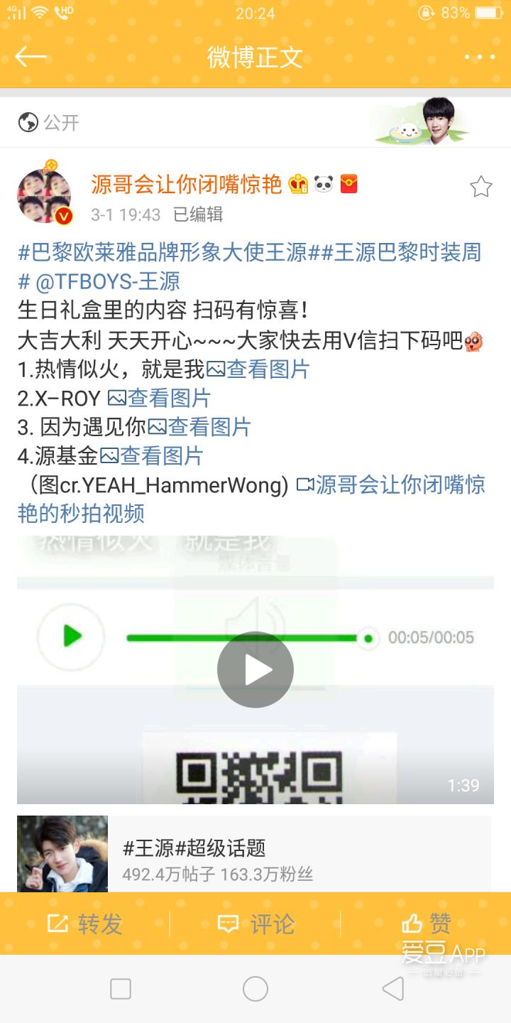 180301 粉丝分享王源生日厉害惊喜内容 扫二维码惊现王源薄荷声声