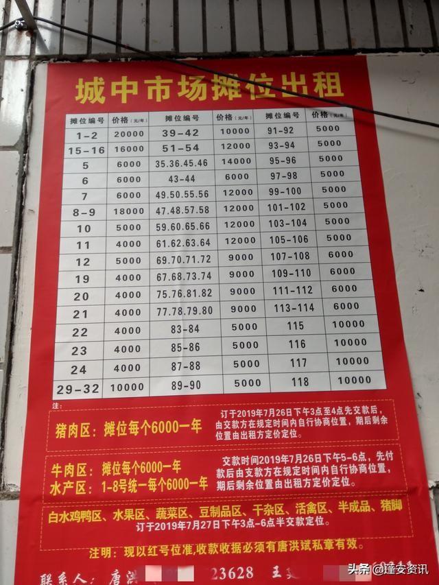 网友“南充新视角”:7月26号下午在蓬安城中市场大门处看到的摊位出租价格表,上面较为详细写有市场里各个摊位的具体价格,最低4000源。最高20000元。希望能对想在蓬安做点小生意的人士一点参考吧