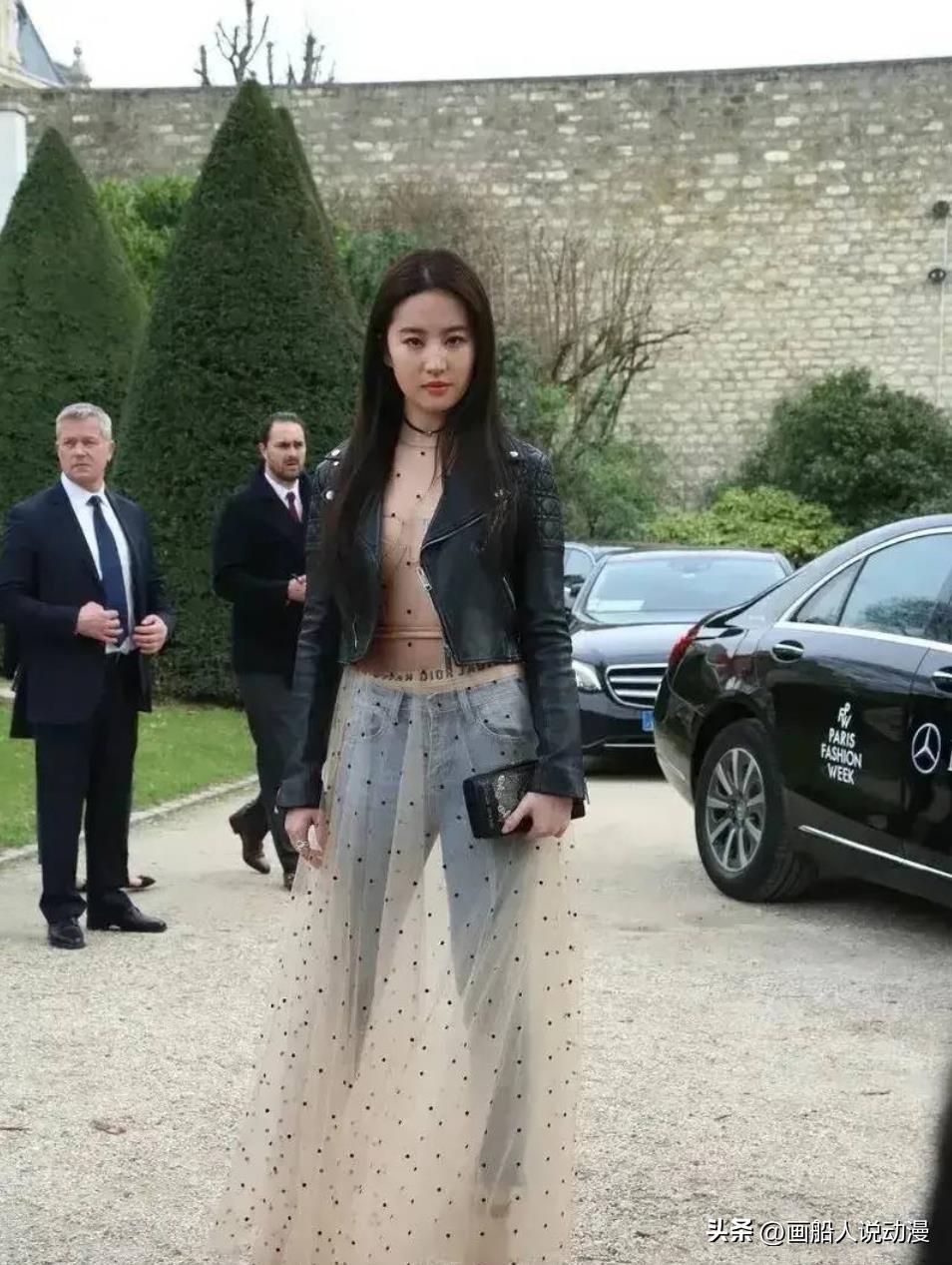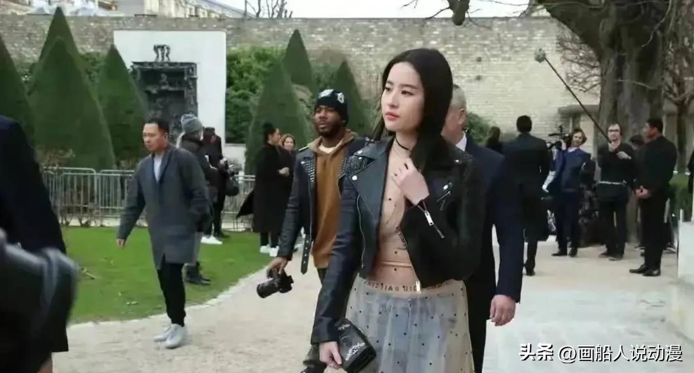 可以看到刘亦菲的穿着是很前卫的,上身是一件黑色皮衣,真空上阵,下身则是一条牛仔裤搭配一条薄纱,走在国外的活动现场,刘亦菲自信满满。