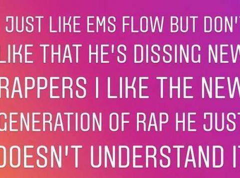 贾斯丁.比伯称:我喜欢Eminem的风格(flow),但不喜欢他贬低新的饶舌歌手。我喜欢新一代的饶舌,(Eminem)却不懂。
