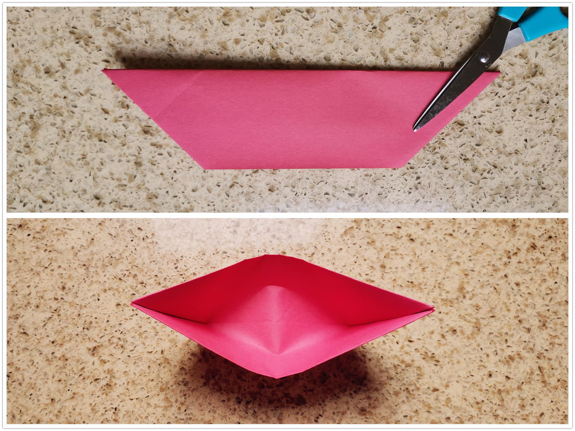 5、把上面折下来,再从中间打开,就能得到船身啦!