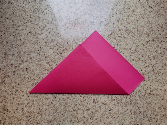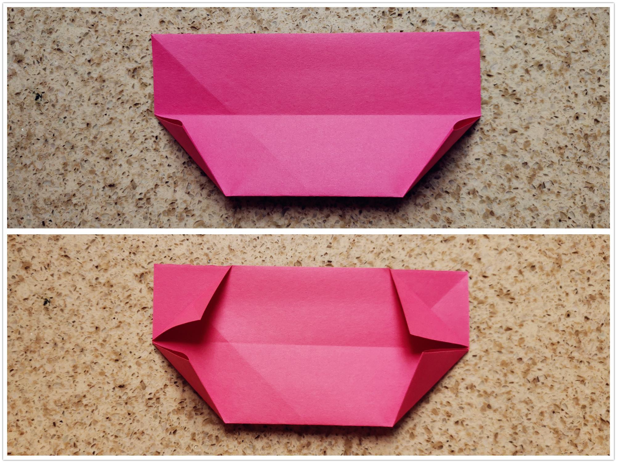3、打开至只对折一次时的长方形,把上下四个角折出三角形