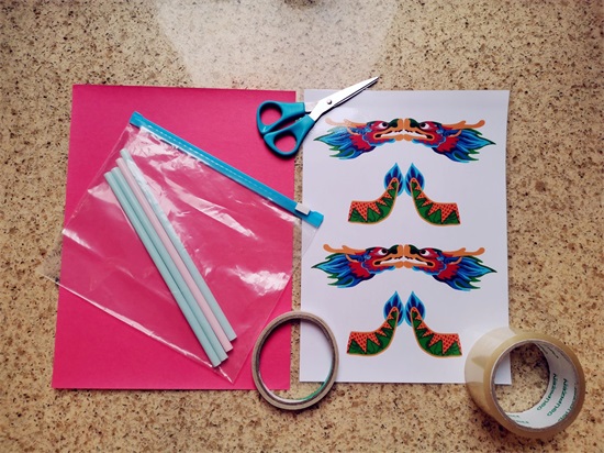 非常简单:一张彩色纸、一张印有彩龙的打印纸(图纸会分享)、一把剪刀、吸管、双面胶和封口胶、一盆水