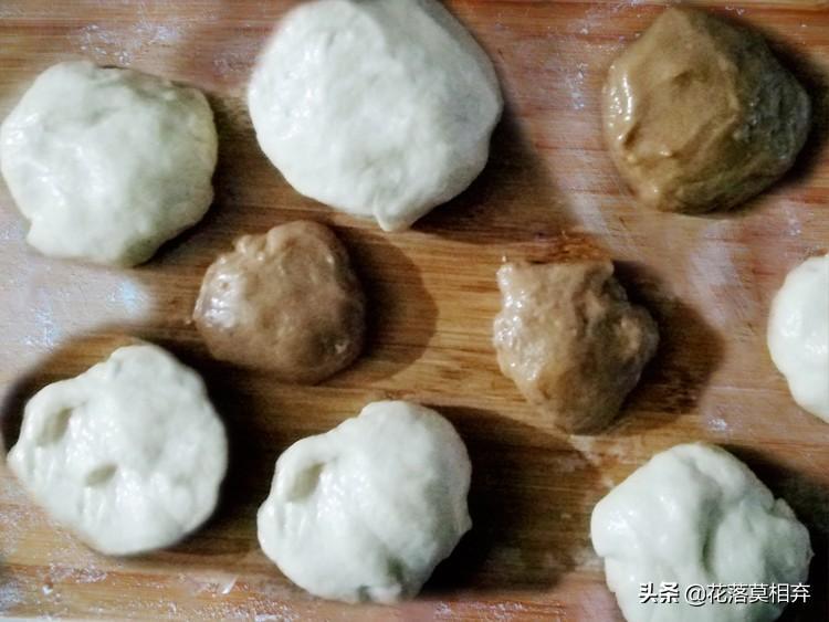 发酵好的面放在案板上轻轻揉成光滑的长条状,分成大小相等的剂子,揉成圆;糖面也是同样的做法分成小一点的圆剂子。